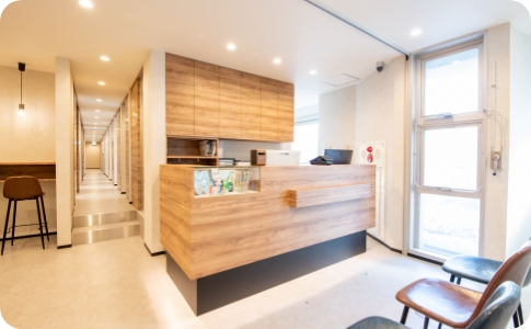木の温もりのある広々と落ち着いた色調の受付にて、皆様をお迎えいたします。入り口には一段、段差がございます。土足のままお入りください。